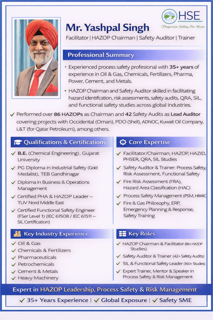 Comprehensive professional training on HAZOP (Hazard and Operability Study) methodology. Designed for engineers and safety professionals involved in process design, operations, and risk assessment. The session focuses on systematic identification of hazards and operability issues to improve safety and reliability in industrial processes.